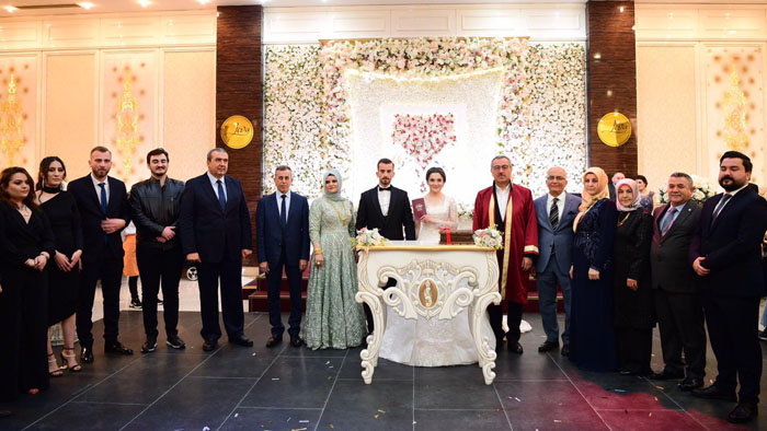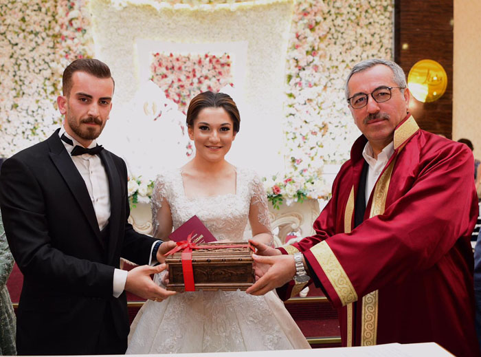 Kahramanmaraş Büyükşehir Belediye Başkanı Hayrettin Güngör’ün salona gelmesi ile resmi nikah törenine geçildi.